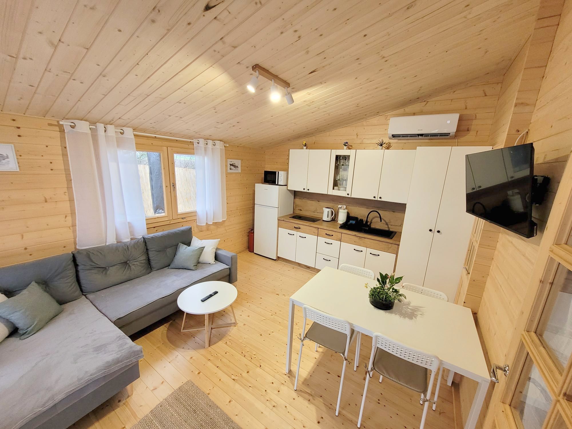 Nasz domek pomieści komfortowo 4 osoby. Posiada pokój dzienny z pełni wyposażonym aneksem kuchennym, sypialnie oraz łazienkę z kabina prysznicowa.